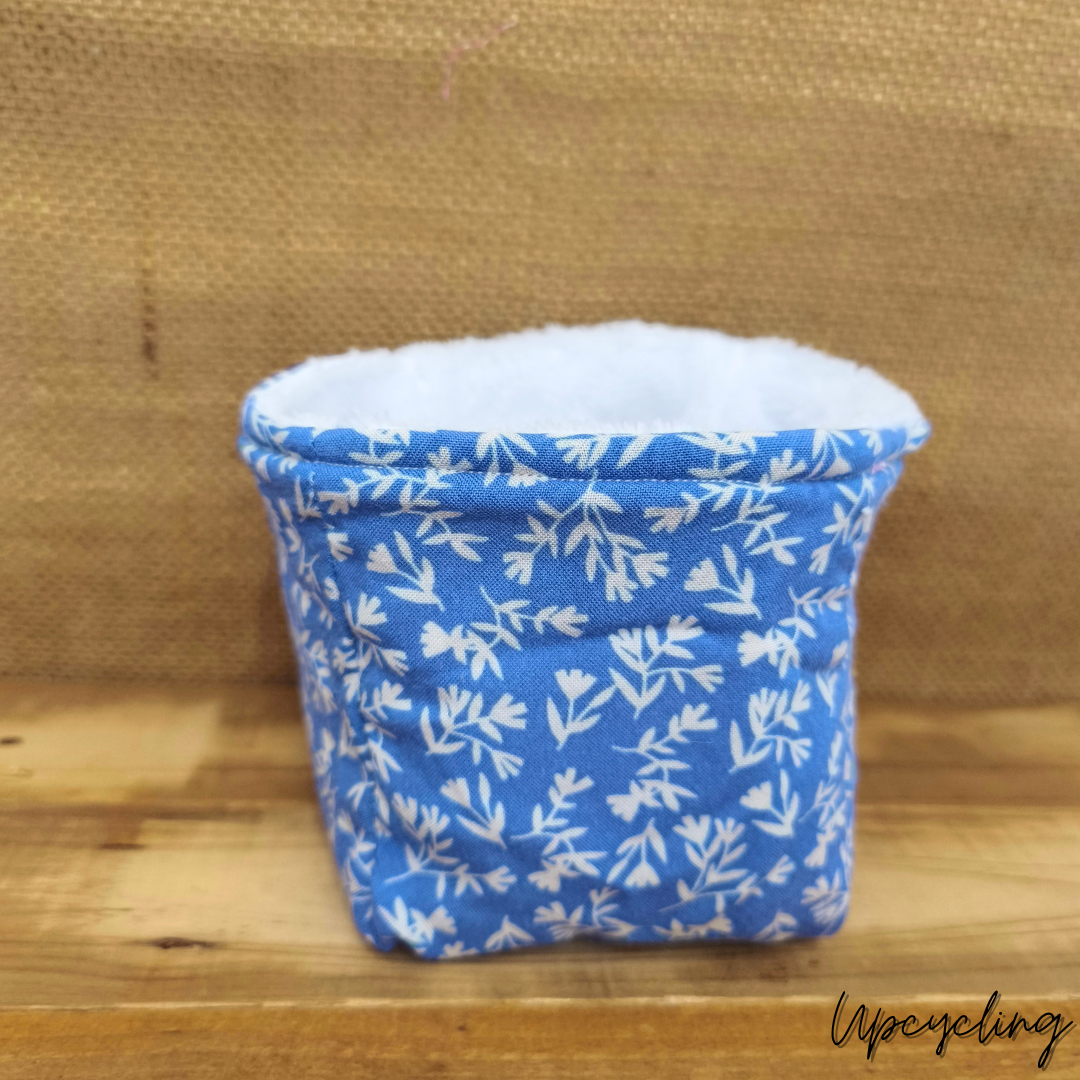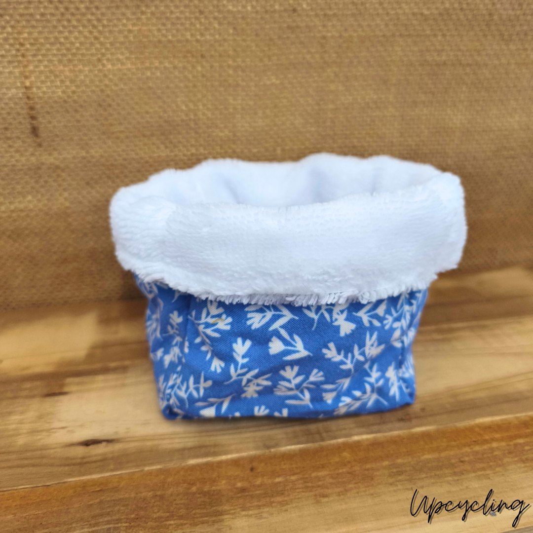Ce panier à cotons lavables Eolia, confectionné à la main avec un mélange tout doux de coton bambou et de tissu bleu clair à fleurs, allie praticité et charme. Parfait pour ranger tes cotons démaquillants lavables (tous les cotons), conçu avec soin à partir de tissus upcyclés issus de tissu de seconde main, ce qui lui confère un caractère unique et surtout éthique. Chaque panier est cousu avec minutie, garantissant ainsi sa durabilité et son authenticité.